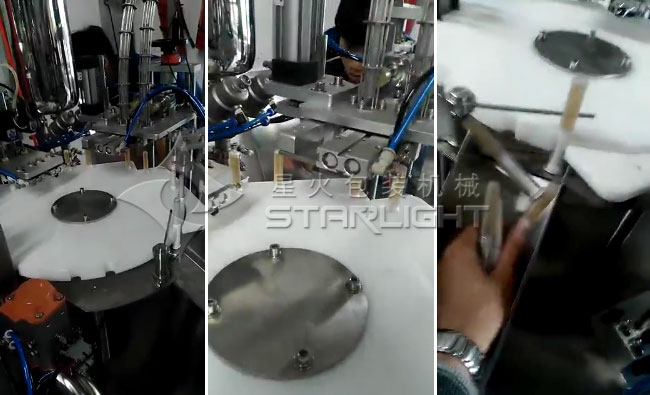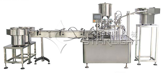 外用凝膠灌裝生產(chǎn)線外形結(jié)構(gòu)上可分為理管機和灌裝機兩個部分裝置,外套經(jīng)過整理進入理管轉(zhuǎn)盤,當待灌裝的管子由輸送帶送入灌裝機,由工作機構(gòu)將管子送入工作主轉(zhuǎn)盤。由光電探測傳感器檢測是否有待灌裝的凝膠管存在,用于決定是否灌裝(有管灌裝、無管不灌裝)。灌裝槍自動下移進管內(nèi),凝膠自動注入管內(nèi)。帽蓋經(jīng)過自動落蓋機構(gòu)的整理,按順序進入該自動落蓋工位,有出料工位完成zui終灌裝成品的輸出。