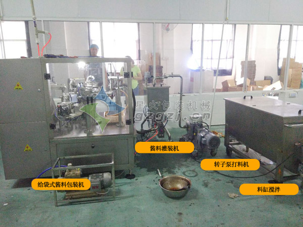 徐州青創食品有限公司是一家致力于火鍋底料及蘸料的生產企業;對于其產品的包裝過程主要要求物料均勻、包裝密封性好、圖案完整;我們在甜辣醬包裝機前端為其配置了單獨的料缸攪拌機,這是保證大顆粒粘稠物料不沉淀的第一步;其后通過轉子泵打料機交由醬料灌裝機再次攪拌;給袋式醬料包裝機作為最后的包裝工序也是最關鍵的,它的封口效果直接決定了調味醬的保質期;為此,我們標配有光電跟蹤設置,對包裝袋的封口位置、溫度等進行監控和調節;
